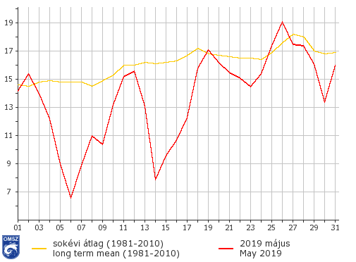 Hideg májusra következtethetünk a napi országos középhőmérsékleti átlagokat tekintve is. Az egész hónapban mindössze négy napon (május 2., 19., 25. és 26.) alakult az országos átlag az éghajlati normál felett, de 1°C-nál nagyobb pozitív eltérés csak május 26-án volt. Az idei május első 3 hete átlagosan még hidegebb volt az előtte levő áprilisnál, amire igen ritkán találunk példát.