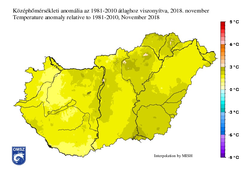 Az 1981-2010-es normálnál 2°C-kal adódott melegebbnek a november országos átlagban. Nagyobb pozitív irányú eltérés a Duna középső és a Tisza alsó szakaszán volt, azonban Budapest környékén és az Északi-középhegység magasabban fekvő területein az anomália értéke elérte a 3°C-ot is. Átlagos hőmérsékletű területek a Marcal-medence és a Dráva-sík tágabb környezete voltak. Negatív irányú eltérés nem jelentkezett országos átlagban.