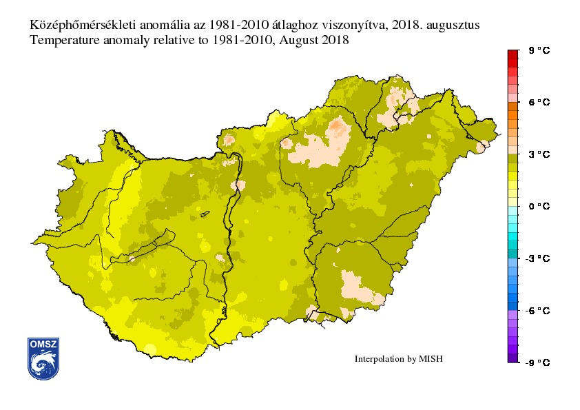 A nyár utolsó hónapja az 1981-2010-es átlaghoz képest 2,6 °C-kal volt melegebb, így az országos átlagban 23,2 °C-os havi középérték a 4. legmelegebbnek számít 1901 óta. Az anomália térképre tekintve nem találunk a sokéves átlagnál alacsonyabb értéket, ugyanakkor a legnagyobb hőmérsékleti eltérést Budapest és a Dél-Alföld mellett az Északi-középhegységben azonosíthatjuk. A Bükkben és a Börzsönyben helyenként 3-4 °C-kal haladta meg a havi középhőmérséklet az 1981-2010-es átlagot.