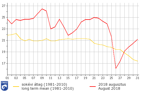 A hónap elején folyatódott a július végén kezdődött kánikula, mivel továbbra is egy magas nyomású légköri képződmény alakította időjárásunkat. Az Országos Meteorológiai Szolgálat veszélyjelzései alapján az országos tiszti főorvos a július végén (07.30-08.03 között) meghirdetett II. fokú hőségriadót augusztus 5-ig meghosszabbította, illetve augusztus 7-10. között újabbat rendelt el. A 3. ábrán látható, hogy az országos átlaghőmérséklet augusztus 8-10 között jóval 25 °C fölé emelkedett. A csúcsértéket augusztus 9-én érte el, mely napon 5,5°C-kal volt magasabb a napi átlaghőmérséklet a sokévi átlagnál. A forró első dekádot követően egy-egy ciklon hidegfrontja hazánkat is érintette, de a hőmérséklet továbbra is a sokévi átlag felett alakult. Az országos átlaghőmérséklet augusztus 21-én újra elérte a 25°C-ot, így a másodfokú hőségriasztást 23-ig kiadták a harmadik hőhullám idejére. Markáns lehűlést egy Európát átszelő, nagy kiterjedésű frontrendszer hozott, amely mögött hűvös levegő árasztotta el a Kárpát-medencét. A hónap végén egy anticiklon hatására újra meleg, nyári idő alakult ki.