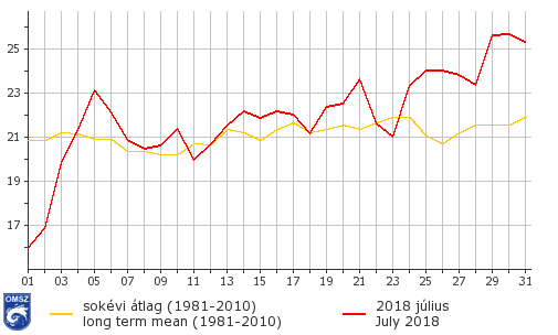 Július a szokásostól jóval hűvösebb és száraz időjárással kezdődött egy hazánktól északkeletre örvénylő ciklon hatására. A légörvény hatásának gyengülésével pár napig az átlagosnál melegebb időjárás alakult ki. Később változékonyabbra fordult az idő, mivel gyenge frontok és magassági hidegcseppek vonultak át felettünk, de jelentős lehűlés nem történt. A hónap utolsó dekádjában az anticiklonális hatások uralomra jutásával megérkezett az igazi nyár, és a hónap végére már kánikula alakult ki. Július 29-31 között már országos átlagban a napi középhőmérséklet 3 napon keresztül 25 °C felett alakult. Az első nyári hőhullám idejére II. fokú hőségriadót rendeltek el 2018.07.30-tól kezdődően.