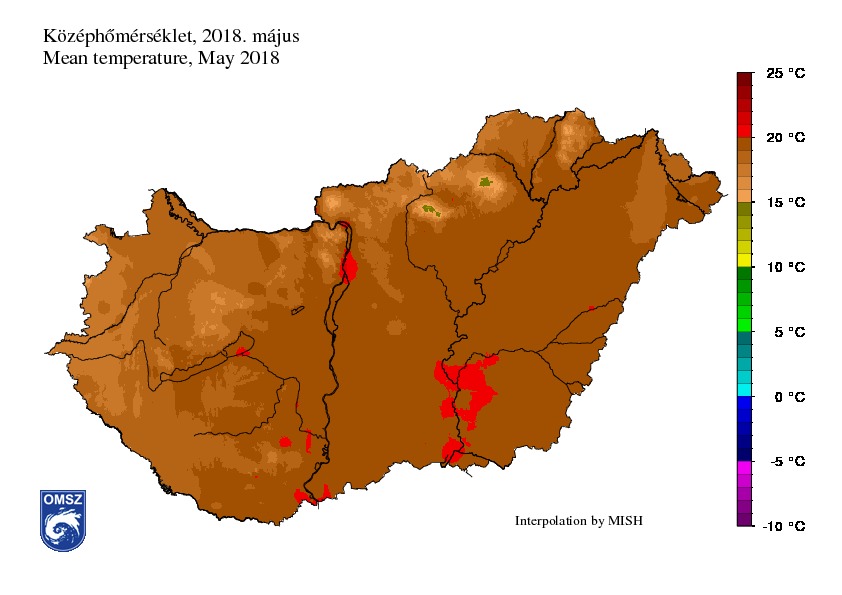 A szokásosnál 2,9°C-kal volt melegebb az idei május az 1981-2010-es átlaghoz képest és ezzel a 3. legmelegebbnek adódott 1901 óta. Csupán 0,1°C-kal maradt el a valaha mért legmelegebb májusi középhőmérséklettől, melyet 2003-ban mértünk. Az anomália térképet tekintve látható, hogy sehol nem jelentkezett átlagosnál alacsonyabb érték. A legmelegebb területek foltokban jelentkeztek, a Dunántúl tágabb környezetében, az Északi-középhegység területén, a Dél-Alföldön, valamint Budapest környékén. A legnagyobb pozitív anomália értéke meghaladta a 3°C-ot is.