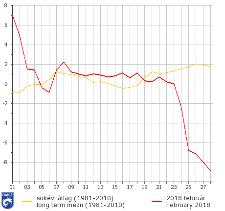Kezdetben hazánk magasnyomású légköri képződmény hatása alatt állt, így jóval az átlag felett alakult az országos napi középhőmérséklet. Csongrád megyében február 2-án a csúcshőmérséklet meghaladta a 16 °C-ot. Később egy észak-európai ciklonhoz tartozó kiterjedt hullámzó frontálrendszer hatására lehűlés vette kezdetét. A hónap közepén a gyakori frontátvonulásoknak köszönhetően a sokévi átlag közelében maradt a hőmérséklet. A hónap utolsó harmadában a Kárpát-medence fölé északkelet felől fokozatosan egyre szárazabb, több fokkal hidegebb levegő áramlott, és erős lehűlés kezdődött. Február végére országos átlagban 8-9 fokkal volt hidegebb, mint a szokásos. A tél legvégén február 26-án -18 °C-ig csökkent a hőmérséklet a Kékestetőn a hótakaró felett. A zord, téli idő kitartónak bizonyult, és még március elejének időjárását is meghatározta.