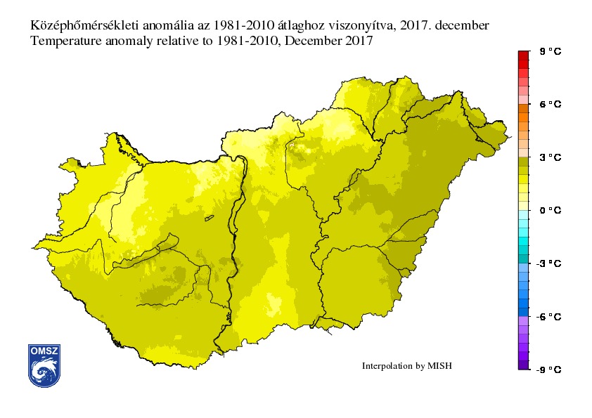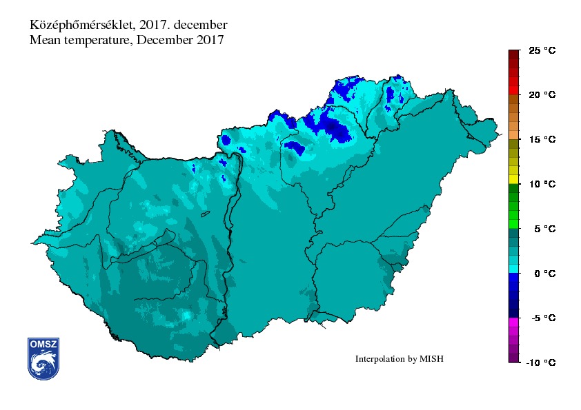 Decemberben az ország nagy részén a havi középhőmérséklet 0 és +3 °C között változott. A legmelegebb területeket a Dél-Dunántúlon figyeltük meg, ezeken a tájakon a hőmérséklet +3°C felett alakult. A legmagasabb havi átlaghőmérséklet (3,8 °C) Kaposvár állomáson adódott, a leghidegebb területek Észak-Magyarország hegyvidéki részén találhatóak. A legalacsonyabb havi átlaghőmérsékletet (-2,4 °C) Kékestető mérőállomáson jegyeztük. Országos átlagban a fagyos napok (Tmin ≤ 0 °C) száma 19 nap, a téli napok (Tmax ≤ 0 °C) száma 2 nap volt. A fagyos napok száma 2 nappal, a téli napoké 7 nappal kevesebb, mint az 1981-2010 időszakban megfigyelt országos átlag.