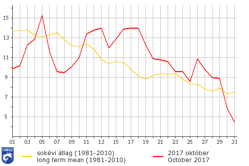 A hónap első harmada meglehetősen hidegnek adódott, csupán egy rövid időszakban mértünk átlag feletti hőmérsékleti értékeket. Ezt követően egy kiterjedt anticiklonnak köszönhetően egy nyugodt, száraz, sok napsütéssel és átlag feletti csúcshőmérséklettel teli időszak köszöntött be, igazi vénasszonyok nyarát idézve ezzel. Ennek köszönhetően 17-én megdőlt a legmagasabb minimumhőmérséklet fővárosi rekordja, Budapest János-hegy állomáson mindössze 15,2°C-ig süllyedt a levegő hőmérséklete. Október végén egy markáns hidegfront vonult végig az országon, amely meglehetősen szeles és hűvös időt hozott.