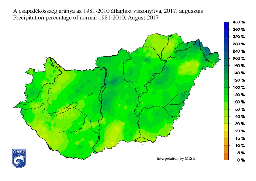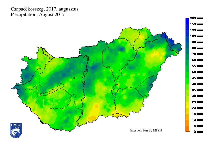 Országos átlagban közel 45 mm volt az augusztusi csapadékmennyiség, amely az 1981-2010-es normál 72 %-a. A sokévi átlag kétszerese hullott a Felső-Tisza-vidéken. Az átlagosnál 20-40 %-kal esett több az ország középső területein, a Tisza-tónál és a Körösök mentén. A normálérték 30-40%-a érkezett a Göcsej és a Balaton térségébe, valamint a Duna-Tisza köze déli részére.