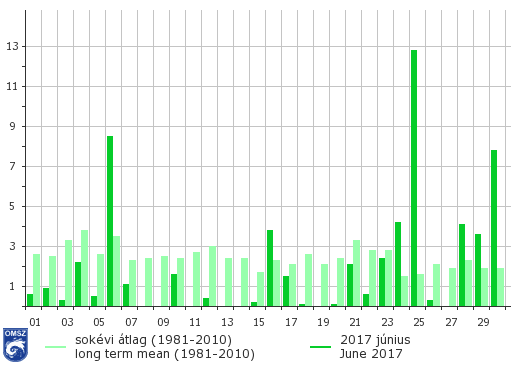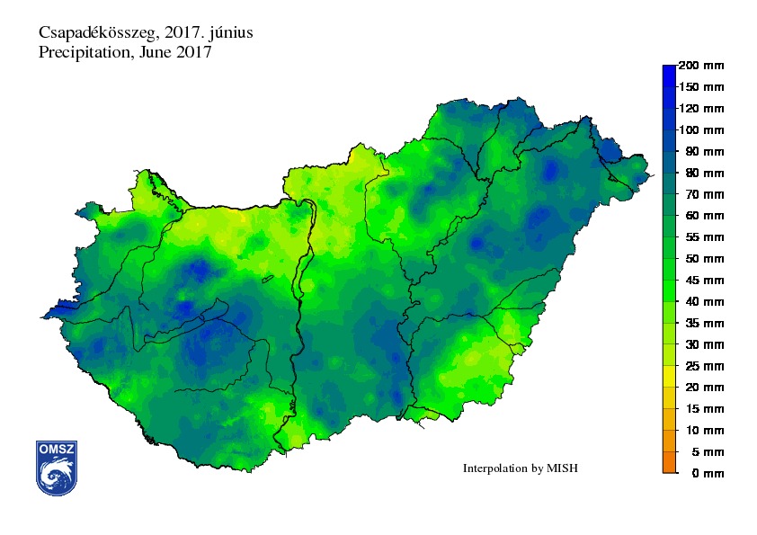 Az év során a június gyakran a legcsapadékosabb hónapunk, azonban idén országos átlagban kissé szárazabbnak bizonyult. A havi csapadékösszeg 59mm-nek adódott, amely közel 13%-kal maradt el a sokévi átlagtól. Ugyanakkor a heves zivatarok, felhőszakadások révén az északkeleti országrész jelentős hányadán, a Kecskemét-Szeged sávban, a Balaton tágabb környezetében helyenként 100mm feletti csapadékot összegeztünk. A legnagyobb havi csapadékot a Veszprém megyei Nagyvázsonyban mértük, ahol júniusban összesen 141,3mm hullott. Nyíregyháza Sóstón 97,4mm csapadék érkezett egyetlen egy nap alatt, június 6-án. Északon a Kisalföld, a Börzsöny, a Cserhát és a Gödöllői-dombság maradt csapadékszegény, míg a déli országrészben a Mohácsi-sík, az Illancs és a Békési-sík. Ezeken a tájakon jellemzően 30-40mm-nek adódott a havi csapadékösszeg. A legkevesebb csapadékot (20,5mm) Nógrád megyében, Nemti településen és Budapest XIII kerületben összegeztük.