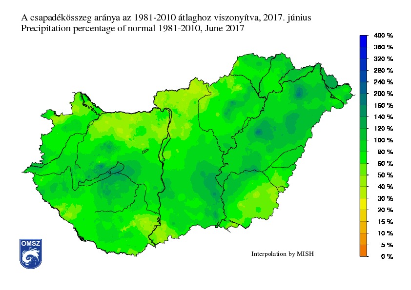 A júniusi záporok és zivatarok helyenként a sokévi átlagnál több csapadékot hoztak a Tiszántúlon és a Balaton keleti medencéjében (120-140%). A határhoz közeli északi és déli országrészben mindössze az 1981-2010-es sokévi csapadékmennyiség 40-50%-a volt jellemző.