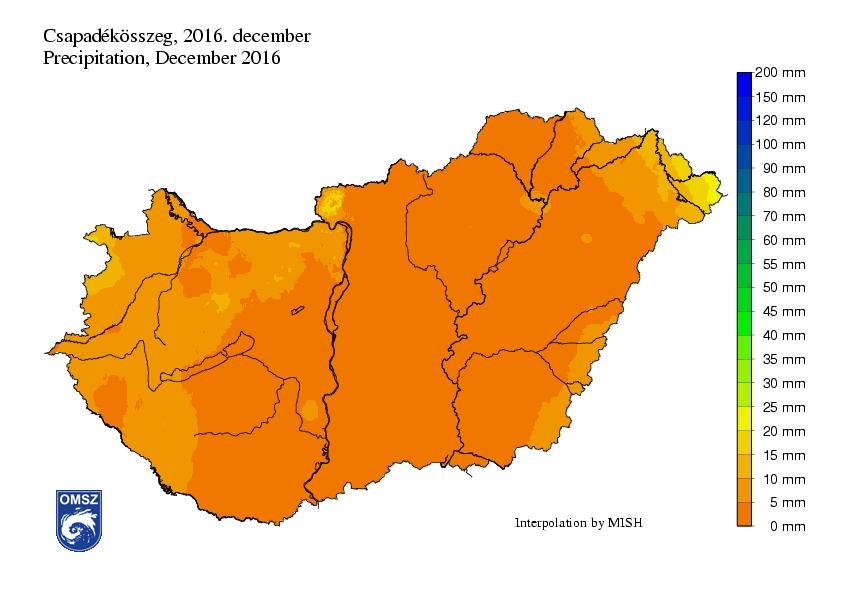 A decemberi átlagos csapadékmennyiség az 1981-2010-es sokévi átlag mindössze 8 %-a, így az egész országban jelentős csapadékhiány mutatható ki a sokévi átlaghoz viszonyítva. A legcsapadékosabb tájakon (Felső-Tisza vidék, Börzsöny, Soproni-hegység) a normálérték alig 30-40 %-a hullott le, míg az Alföld középső területein és a Dél-Dunántúlon alig 5 %-a.