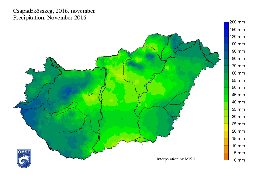 A havi csapadékmennyiség leginkább a magasabban fekvő területekre és a nyugati országrészre koncentrálódott, 80-90 mm feletti értékeket eredményezve. A Vas megyei Szalafőn regisztráltuk a legnagyobb havi összeget, 106,7 mm-rel. Az ország középső részén és a Mezőföld északi területén jelentkezett a legkisebb csapadékösszeg. A Fejér megyei Zichyújfalu Gárdony állomáson mértük a legkisebb havi csapadékösszeget, 26,6 mm-rel.