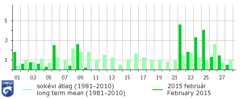 A legtöbb csapadék országos átlagban 22-én hullott (4,6 mm), ezt követi a 25-i (3,9 mm) és a 24-i mennyiség (2,5 mm). A 11-e és 21-e közötti napokban hazánk teljes területének átlagában nem hullott számottevő csapadék. Négy havas napot jegyeztünk a sokéves átlag alapján megszokott 6 havas nap helyett.