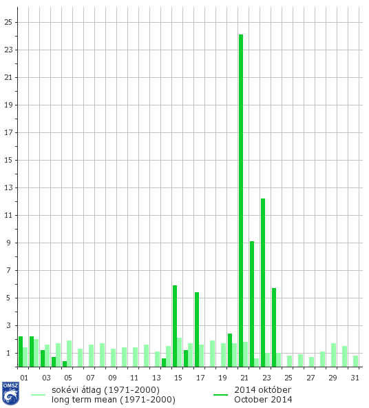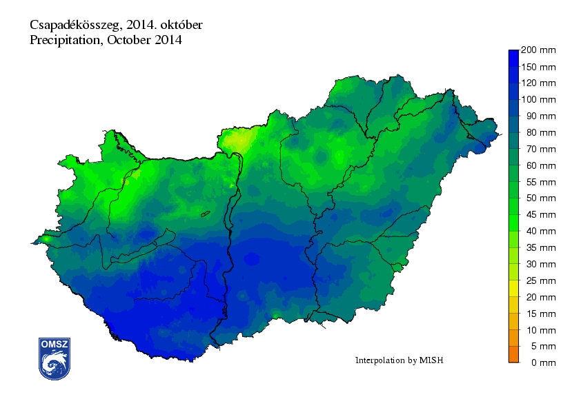 Októberben átlagosan 73 mm csapadék hullott, ez 29 mm-rel több, mint a sokéves átlag (44 mm). Az ország DNy-i részén hullott a legtöbb eső, itt 100-150 mm közötti mennyiségeket jegyeztünk, É-on pedig 35-55 mm között alakult ez az érték. Mázán 168,7 mm-t mértek, ez volt az e havi legnagyobb érték. A minimumot Diósjenőből jelentették (25,4 mm).