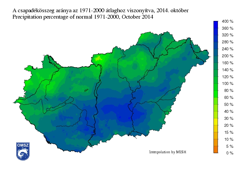 Az ország legnagyobb részén az átlagnál jóval több csapadék hullott októberben. Az anomália térkép maximuma a Duna-Tisza-közén Bács-Kiskun megyében található. Itt a havi várható érték háromszorosa – három és félszerese hullott.