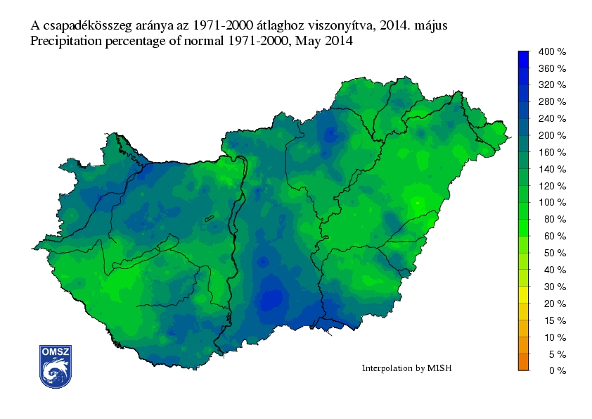 Országos átlagban a sokéves átlaghoz képest jóval több csapadék hullott ebben a hónapban. A Tiszántúlon és a Dunántúl középső részén hullott kevesebb csapadék, de ez a mennyiség is az éghajlati átlagnak megfelelő volt. A Kisalföldön és az országi déli területein azonban a normál értékek 2-2,5-szerese is lehullott. Bélapátfalván az éghajlati átlag csapadékmennyiség 339,7% esett le a hónap folyamán. A csapadékos áprilist egy szintén csapadékos május követte.