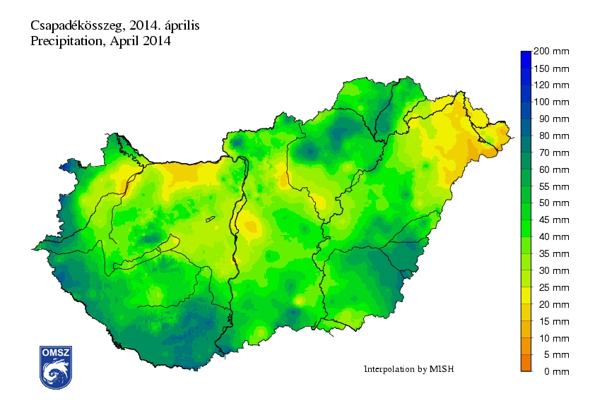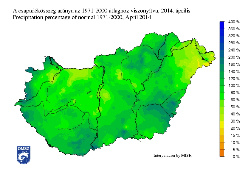 Országos átlagban a sokéves átlagnak megfelelő csapadékmennyiség hullott (91,2 %) le hazánkban április folyamán. Északkeleten és a Dunántúl északi részén hullott kevesebb csapadék (a normál 40-50%-át jegyeztük). Az előző hónapok csapadékhiányos időszaka után április megtörte a trendet.
