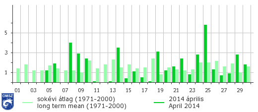 Április hónap folyamán 22 nap hullott csapadék. A 25-i csapadék maximumot (5,3 mm) egy dél felől érkező mediterrán ciklon okozta. Ezen a napon Kékestetőn hullott a legtöbb csapadék (31,3 mm).