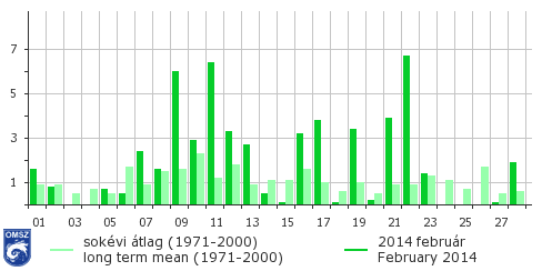 A legtöbb csapadék 11-én hullott, ekkor az országos átlagos napi csapadékösszeg 5,8 mm-nek adódott. Három kiugró érték jelentkezett (9-én, 11-én és 22-én), de a sokéves átlagot jelentősen meghaladta még a 16-ai, 17-ei, 19-ei és a 21-ei összeg is. A legtöbb csapadék 7-e és 23-a között hullott le, a hónap eleje és vége kevésbé bizonyult csapadékosnak országos átlagban. A csapadék zömmel eső formájában jelentkezett februárban, de néhány alkalommal jelentettek havazást is egy-egy állomásunkról (havas napok száma országos átlagban: 1 nap; februári normál: 5 nap; legtöbb havas nap: Kékestető, 8 nap).