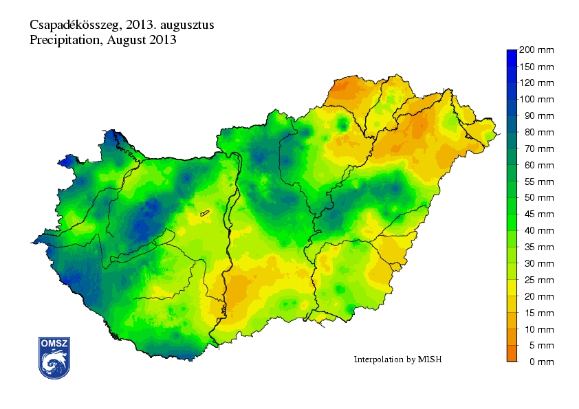 A júliusi szárazság után az augusztus jó részét is a kiterjedt csapadékhiány jellemezte; bőven akadt olyan terület a hónap folyamán, ahol szinte egyáltalán nem, vagy csak alig esett eső. A legkevesebb csapadék D-en és ÉK-en hullott (0-25 mm között), a legcsapadékosabbnak pedig a nyugati határszél, a Balaton környéke és a Tiszántúl középső területe bizonyult (60-120 mm).