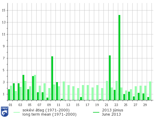 2013 májusának utolsó és júniusának első napjaiban rövid idő alatt nagy mennyiségű csapadék hullott le a Duna felső vízgyűjtőjében, elsősorban Győr és Linz között, mely a Duna megáradásához vezetett. A 2013-as dunai árvízről bővebben olvashatnak honlapunk tanulmányai között (cím: „A 2013. júniusi dunai árvíz időjárási háttere”). Hazánkban országos átlagban a legtöbb csapadék június 24-én esett: a másik két kiemelkedő érték 10-én és 22-én meg sem közelíti a 24-i mennyiséget. A hónap legmagasabb napi csapadékösszege is 24-éhez kötődik: Szikszó állomásunkról 75 mm csapadékot jelentettek ezen a napon. 7 napon jegyeztünk normált meghaladó napi csapadékösszeget, a hónap közepén pedig 6 napon keresztül nem hullott számottevő csapadék országos átlagban.