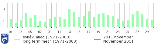 Az országos átlagban vett napi csapadékösszegek grafikonján mindössze egy napon, 7-én jelent meg értékelhető eredmény. Ezen a napon hullott le a Baranya megyében tapasztalt csapadék nagy része. Az újfehértói állomáson mért 4,4 mm-es csapadékösszeg több kiscsapadékú esemény során adódott össze, a mérőhelyen 8 napon is regisztráltak 0,1 mm-t meghaladó mennyiségű csapadékot.
