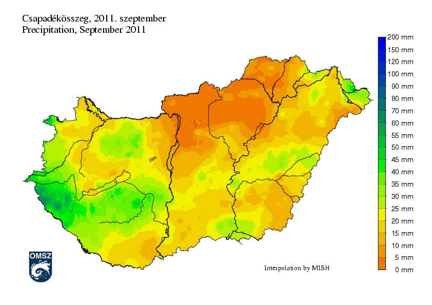A fenti térkép zöldes, narancsos színei is arra utalnak, hogy az idei szeptember rendkívül száraznak számított. A csapadékban szegény északi országrészben a sokéves havi csapadékhozamnak kevesebb mint 5%-a hullott le, de az ország területén regisztrált összegek jellemzően nem érték el a szokásos mennyiség felét sem. Kivételt ez alól csak a bőségesebb csapadékú térségek jelentettek, de az értékek itt is átlag alattiak voltak.