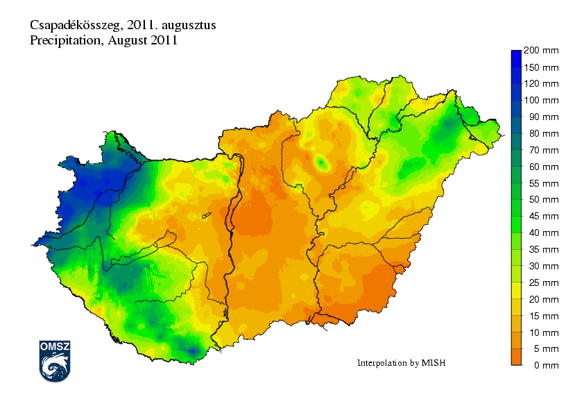 A csapadék területi eloszlása meglehetősen szélsőséges volt ebben a hónapban. Míg az ország középső részében 20, sőt kisebb területen 5 mm-nél is kevesebb csapadék hullott, az északnyugati országrész csapadékhozamai a 100 mm-t is átlépték. Ehhez képest viszonylag csapadékos volt még a Dél-Dunántúl, illetve 50 mm feletti értékek jelentek meg az ország északkeleti csücskében is.