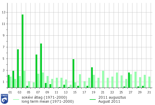 A csapadékösszegek napi bontása is a szokásosnál szárazabb hónapot mutat. Országos átlagban jelentősebb mennyiségű csapadék 4-én hullott, megközelítve a 13 mm-t, ezenkívül csupán még 3 napon, 3-án, 7-én és 8-án jelentkezett említésre méltó, 5 mm-t meghaladó csapadékösszeg. 4-én a nagy mennyiségű csapadék a Dunántúl nyugati felét érintette, Villány állomásunkon a napi csapadékösszeg rekordja is megdőlt, 114,4 mm-rel, de 100 mm fölötti összegről érkezett jelentés kemenesszentmártoni állomásunkról is.