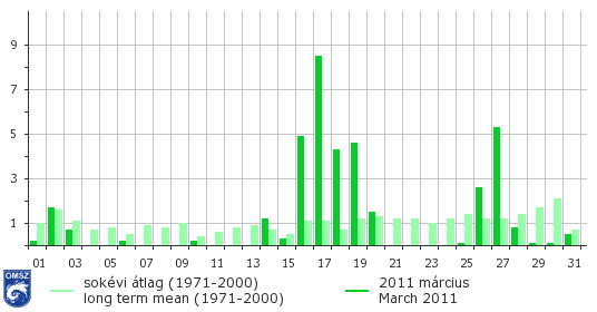 A hónap során két csapadékosabb időszak jelentkezett. Első ízben március 16-19 között, amikor mind a négy napon 3 mm-nél több csapadék hullott országos átlagban, másodszor pedig 26 és 27 között. A legcsapadékosabb nap 17-e volt. Ekkor az esőzés első sorban az északkeleti országrészt érintette, országos átlagban ezen a napon a lehullott csapadék mennyisége a 9 mm-t is megközelítette.