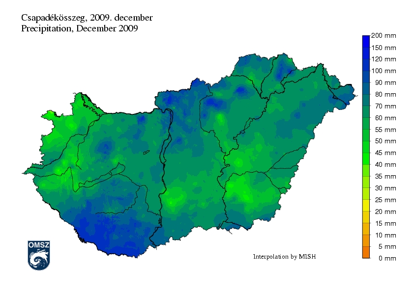 Szinte az egész ország területén átlag feletti havi csapadékösszeg volt jellemző. Csupán a Zala-folyó térsége és a Kalocsai-Sárköz volt szárazabb az átlagnál, ezeken a területeken a sokévi átlagnak megközelítőleg 80%-a hullott. Míg az Alföldön és a Dunántúl észak-nyugati felében 20-40%-ot ért el az anomália, az Északi középhegységben a vártnál kétszer, sőt az északi határ mentén, egy kis területen háromszor magasabb értékek is előfordultak. Jelentős pozitív eltérések rajzolódtak ki a Dunántúl déli részén is (a szokásos 170-200%-a), a maximum a Villányi-hegység környékén meghaladta az átlag kétszeresét.