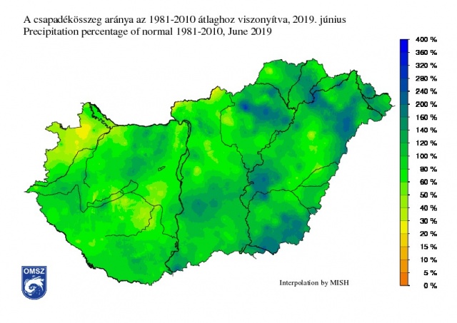 2019 júniusa a legmelegebb volt 1901 óta. Országosan közel átlagos mennyiségű csapadék érkezett, azonban több helyen a felhőszakadások és a viharok jelentős károkat okoztak.