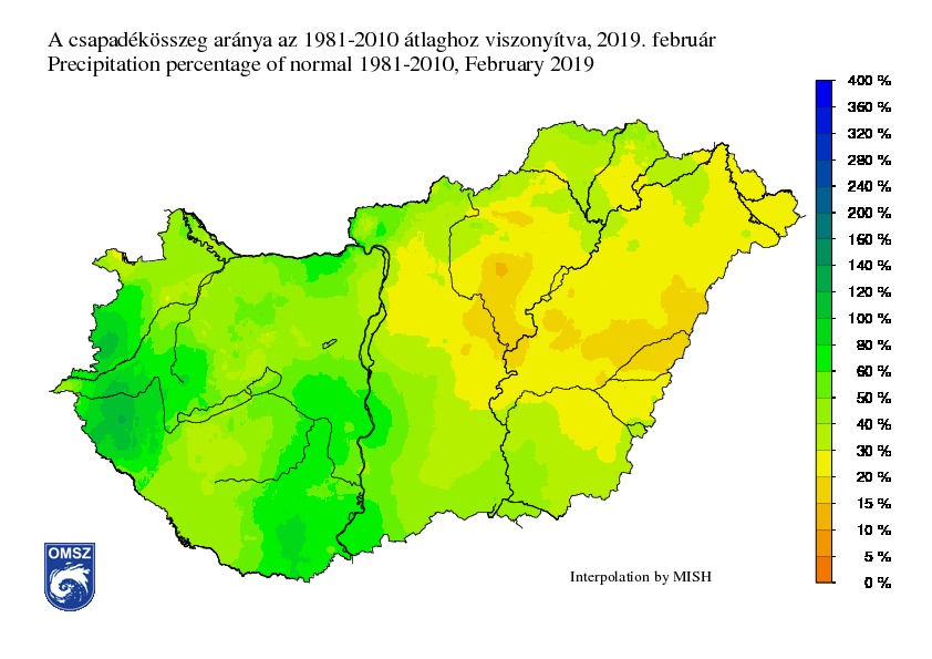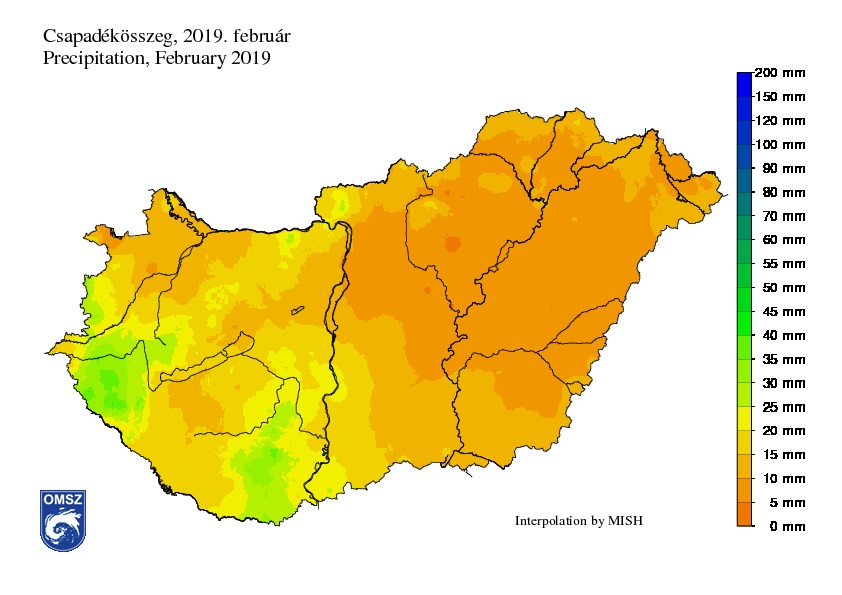 A február igen csapadékszegény volt: országos átlagban mindössze 13 mm csapadék érkezett, mely messze elmaradt az 1981-2010-es sokévi átlagtól. A legtöbb csapadék a Dunántúlon Zala és Baranya megyében hullott, mely 30 mm feletti összegeket jelentett. Ugyanakkor az ország szinte teljes egészén a havi összeg 15 mm alatt marad. A legkevesebb csapadékot Heves megyében összegeztük, itt egy-egy állomáson a havi összeg nem érte el az 5 mm-t sem.