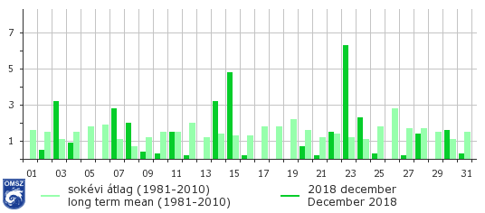 Az igen száraz október és november után decemberben továbbra sem érkezett annyi csapadék, ami a korábbi hiányokat pótolni tudta volna. Decemberben országos átlagban 26%-kal kevesebb csapadék hullott. A legtöbb csapadék az északi országrészben a Mosoni-síkon, a Gerecsében, a Dunazug-hegységben és a Börzsönyben, illetve a Felső-Tisza vidéken hullott. Ugyanakkor a Nyugat- és Dél- Dunántúlon lehulló csapadék mennyisége nem érte el a 20 mm-t. A hónap folyamán többször havazott, összefüggő hóréteg az országban december közepén alakult ki. A hóréteg havi maximuma 30 cm volt, amelyet december 16-17-én a Csongrád megyei Magyarcsanád Bökény állomáson jegyeztünk.