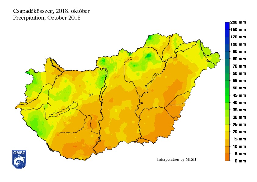 Az októberi csapadékösszeg meglehetősen elmaradt az ilyenkor szokásostól. Országos átlagban mintegy 17 mm csapadék hullott, ami a sokéves átlag csupán 41%-át teszi ki. A legszárazabb területek a déli és a délkeleti országrészben voltak. Egyes helyeken a havi csapadékösszeg az 5 mm-t sem érte el. A legnagyobb havi csapadékösszeg a Bükk területén jelentkezett, Szentlélek állomáson 50,8 mm-t mértek. A legkisebb havi csapadékösszeg pedig Csanádpalotán volt, 3,5 mm-rel.