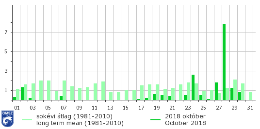 Napi csapadékösszegek és a sokévi átlagok országos átlagban (mm)
