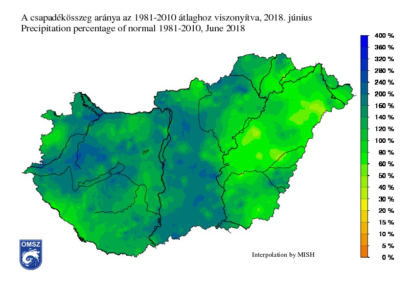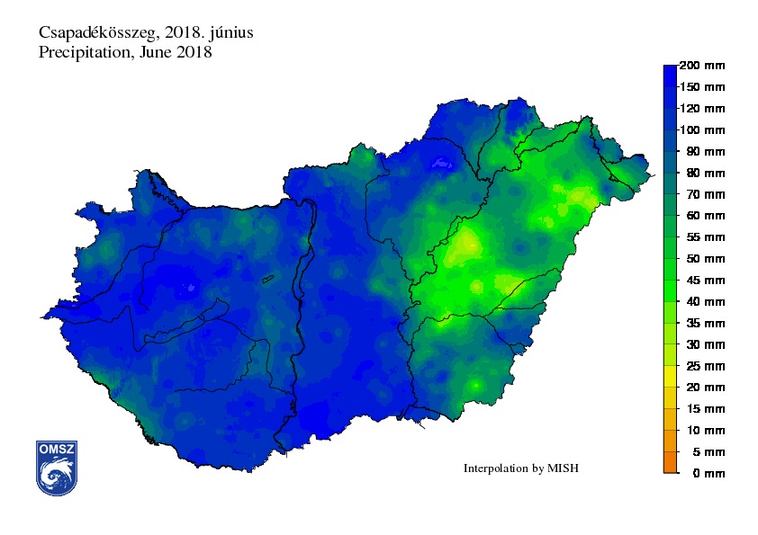 A júniusi csapadékösszeg országos átlagban idén megközelítette a 100 mm-t, összesen 96,5 mm-nek adódott, amely 30%-kal több, mint a sokévi átlag. Területi különbségek igen jelentősek voltak: a Tiszántúlon alig 50 mm érkezett, míg a Nagykunságban 20mm-t sem érte el a lehulló csapadék mennyisége. A legkevesebb csapadékot Jász-Nagykun-Szolnok megyében, Kunmadarason mértük (17,4 mm). Ugyanakkor a heves zivatarok, felhőszakadások miatt a Dunántúlon, és a Duna-Tisza közén jóval 100 mm feletti mennyiséget összegeztünk. Különösen csapadékos időjárás jellemezte a Bükk-hegységet, mivel Bükkszentkereszten júniusban összesen 224,5 mm érkezett. Rekordot döntött Szentlélek állomás, ahol június 10-én 92,1 mm hullott, míg Június 1-én a Vas megyei Pinkamindszenten egyetlen egy nap alatt 93,4 mm csapadék érkezett. Mindkét helyen rövid idő alatt egy teljes hónapnak megfelelő csapadékmennyiség zúdult le, mely jelentős károkkal járt.