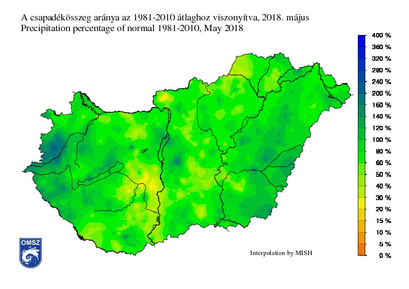 A májusi csapadékmennyiség térbeli eloszlása változatos képet mutat. A legtöbb csapadékot az Alpokalján jegyeztünk, a csapadékmennyiség értéke meghaladta a 120 mm-t is. A legkisebb csapadékösszeg a Solti-síkság területén és foltokban a Börzsöny környékén jelentkezett. Ezeken a területeken mindössze 10-15 mm-t regisztráltunk. A havi csapadékmennyiség országos átlagban 50,3 mm adódott, ami a sokévi átlag mintegy 81%-a.