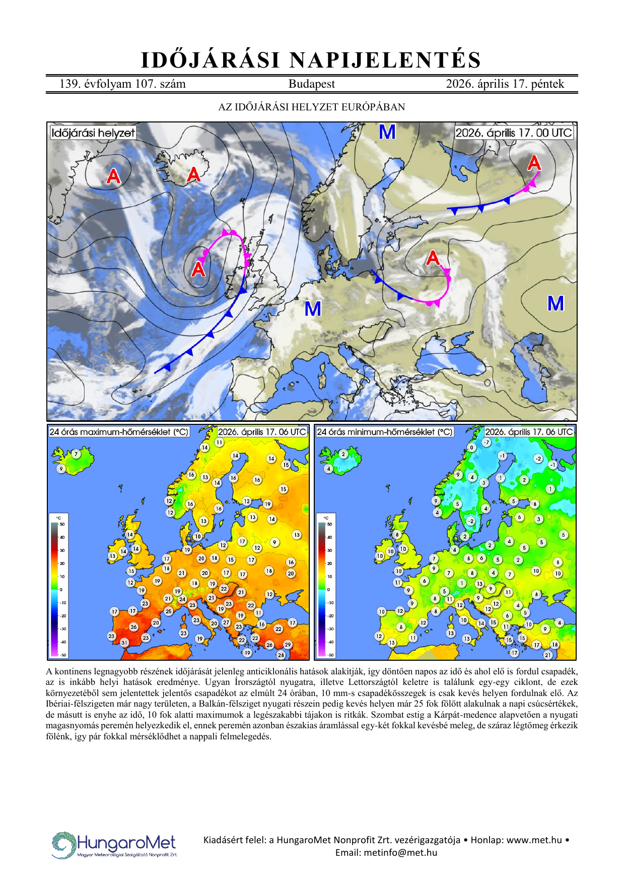 Az európai kitekintés a fronttérkép és a rövid szöveges elemzés mellett bővült a hőmérséklet napi minimum- és maximumértékeit ábrázoló térképekkel.