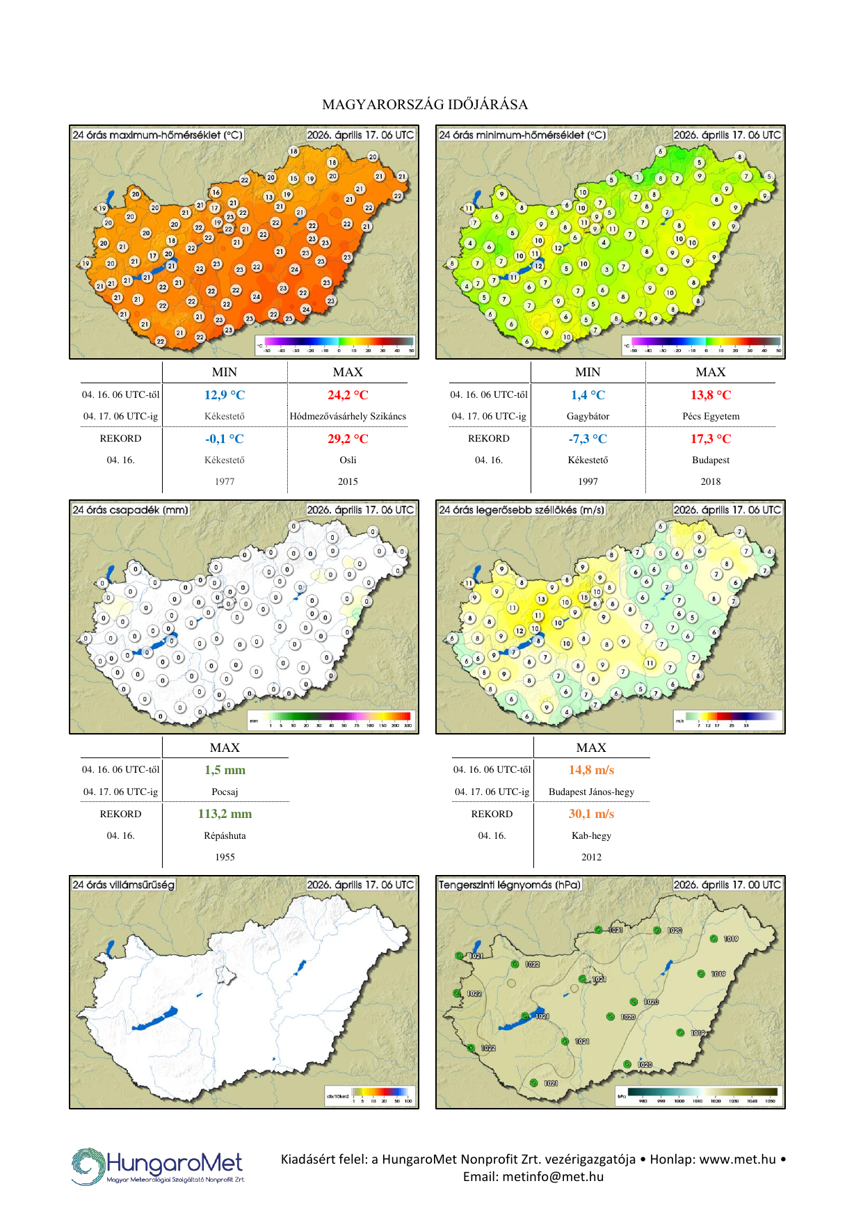 A meteorológiai elemek Hungaromet Zrt. által mért napi értékei ezentúl kontúrtérképeken jelennek meg, de továbbra is tartalmaznak konkrét számértékeket, a korábbinál jóval több állomásról. A térképek alatt táblázatos formában feltüntetjük a napi szélsőértékeket és az abszolút napi rekordadatokat. Az eddigiektől eltérően a napi (24 órás) adatok egységesen, 06 és 06 UTC közötti időszakot fednek le – nagyobb összhangban a nemzetközi gyakorlattal. Az abszolút napi rekordok időszakának tekintetében a hazai évtizedes gyakorlat a következő (rekord napja = aznap):