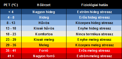 A fiziológiailag ekvivalens hőmérséklet (PET) osztályozása a különböző hőérzet-kategóriák, illetve a fiziológiai hatás alapján (Matzarakis és Mayer, 1996)