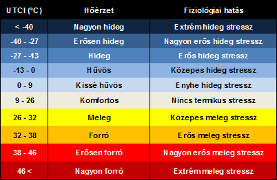 Az univerzális hőmérsékleti klíma index (UTCI) osztályozása a különböző hőérzet-kategóriák, illetve a fiziológiai hatás alapján (Jendritzky et al., 2010)