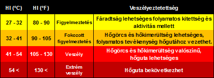 A hőség index (HI) osztályozása a különböző veszélyeztetettség szerint