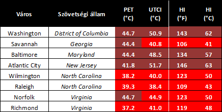 2011. július 20-án a keleti parti régiót elérte a hőhullám. Erősségét mutatják a 4. táblázatban látható bioklíma indexek. Mindhárom index esetében extrém magas értékek adódtak, különösen Washington DC., Baltimore és Atlantic City térségében.