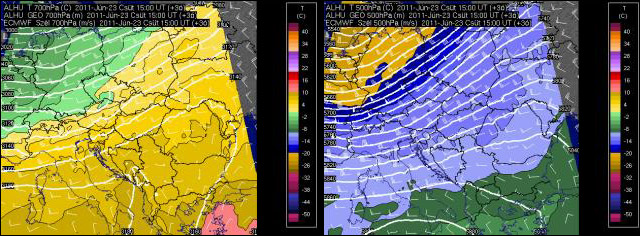 Időjárási helyzet 700 és 500 hPa-on 15 UTC-kor (Aladin modell 12.00 UTC +3h).