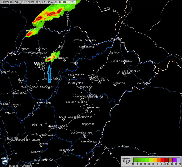 Így szupercellás zivatarok alakultak ki a térségben, amelyek közül több beazonosítható a nagyfelbontású napkori egyedi 120 km-es radarmérés animációja