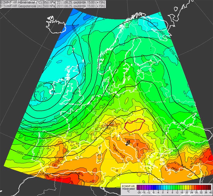 Az ECMWF modell 850 hPa-os hőmérsékleti és az 500-hPa-os geopotenciál mezőjén