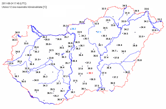 | augusztus 25. | 36.5, Túrkeve 1943 | 23.8, Sátoraljaújhely 2007 | 39.2, Baja-Csávoly | 23.8, Pécs Árpád-tető, rekord beállítás |