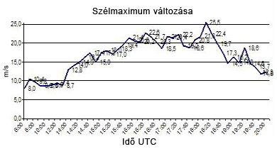 | Napi szélmaximum | 25.5 m/s (92 km/h) |
