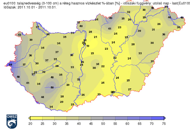 Természetesen a meleg, napfényes időjárás csapadékszegény hónapot eredményezett szeptemberben, emiatt az ország nagyobb részén már súlyos aszályhelyzet alakult ki. Október 1-jén a felső 1 m-es talajrétegben az Alföld közepén szinte nincs is nedvesség, legalábbis a növények számára ez már nem hozzáférhető mennyiség (4. ábra).