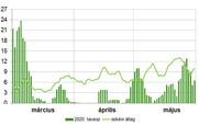 2020 tavasza rendkívül csapadékszegény, a harmadik legszárazabb volt 1901 óta. A március még csapadékosan kezdődött, majd március 8-án egy hosszú száraz időszak vette kezdetét. A száraz időjárás áprilisban és még májusban is folytatódott. Az április a 4., a május a 14. legszárazabb lett az elmúlt 120 évből. A hőmérséklet tekintetében egy átlagosnak mondható tavasz a 2020-as. A március még közel 1,5 Celsius fokkal, az április 0,7 fokkal volt melegebb a sokévi átlagnál, a május viszont a tavalyihoz hasonlóan hűvösen telt, a havi középhőmérséklet 1,8 fokkal elmaradt a megszokottól. További (tér)képes részletek az Éghajlati visszatekintőben találhatók. |