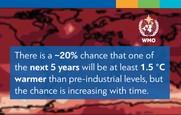 A Meteorológiai Világszervezet (WMO) közleménye szerint az új éghajlati előrejelzések alapján a globális felszíni átlaghőmérséklet-emelkedés a következő öt év (2020–2024) mindegyikében meghaladhatja az 1,0 Celsius fokot az ipari forradalom előtti szinthez képest (amit az 1850–1900 referencia-időszak alapján tekintenek). Sőt egy-egy hónapban a melegedés mértéke 1,5 fokot is elérhet (70%-os valószínűséggel). |